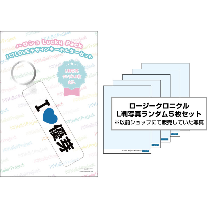 『ハロショLucky Pack 「I LOVEデザインキーホルダーセット」』は、I LOVEデザインキーホルダーとL判生写真ランダム5枚のセットです。